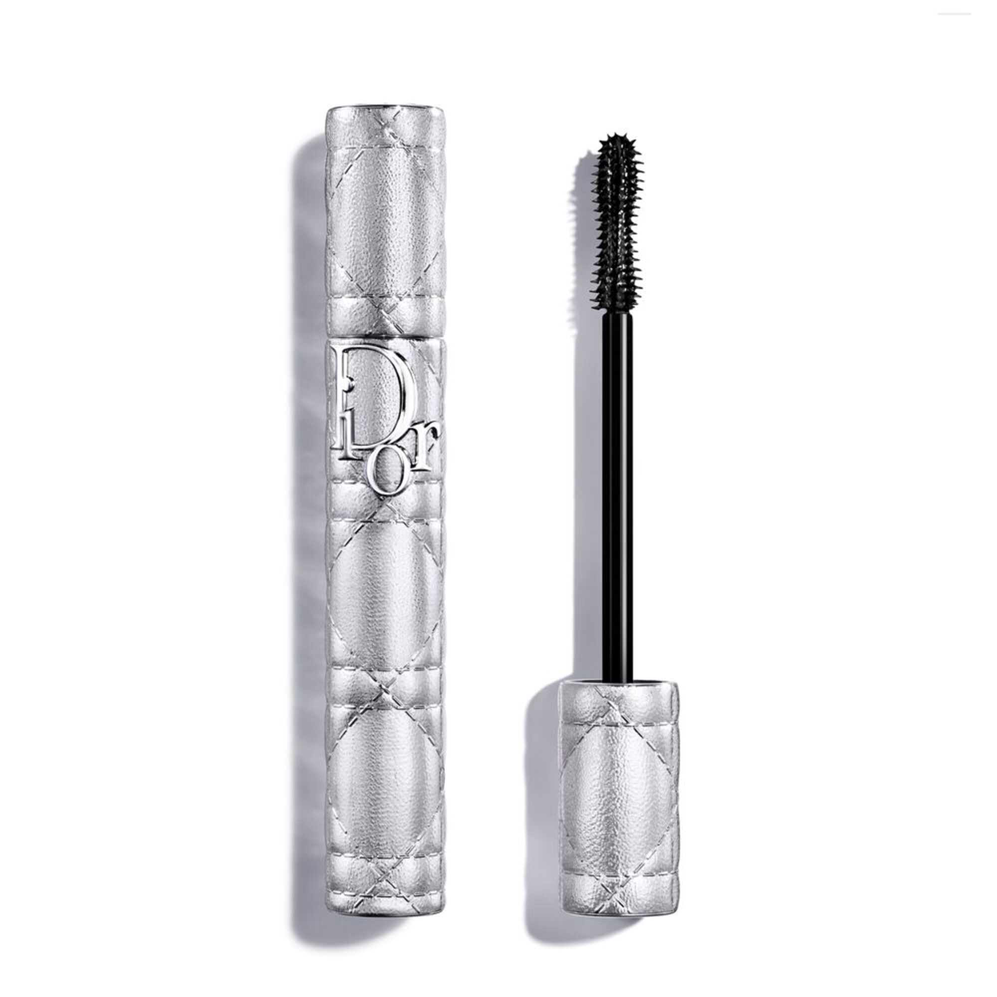 Die Bürste verfügt über eine innovative Kombination von Borsten. Ihr zentraler Vorratsbehälter konzentriert das Produkt und gibt bei jedem Bürstenstrich die richtige Menge ab, ohne zu verklumpen. Das Case dieser Dior Mascara ist mit dem ikonischen Couture Motiv der Maison, dem Cannage, verziert, das in einem metallischen Silberton neu interpretiert wurde.