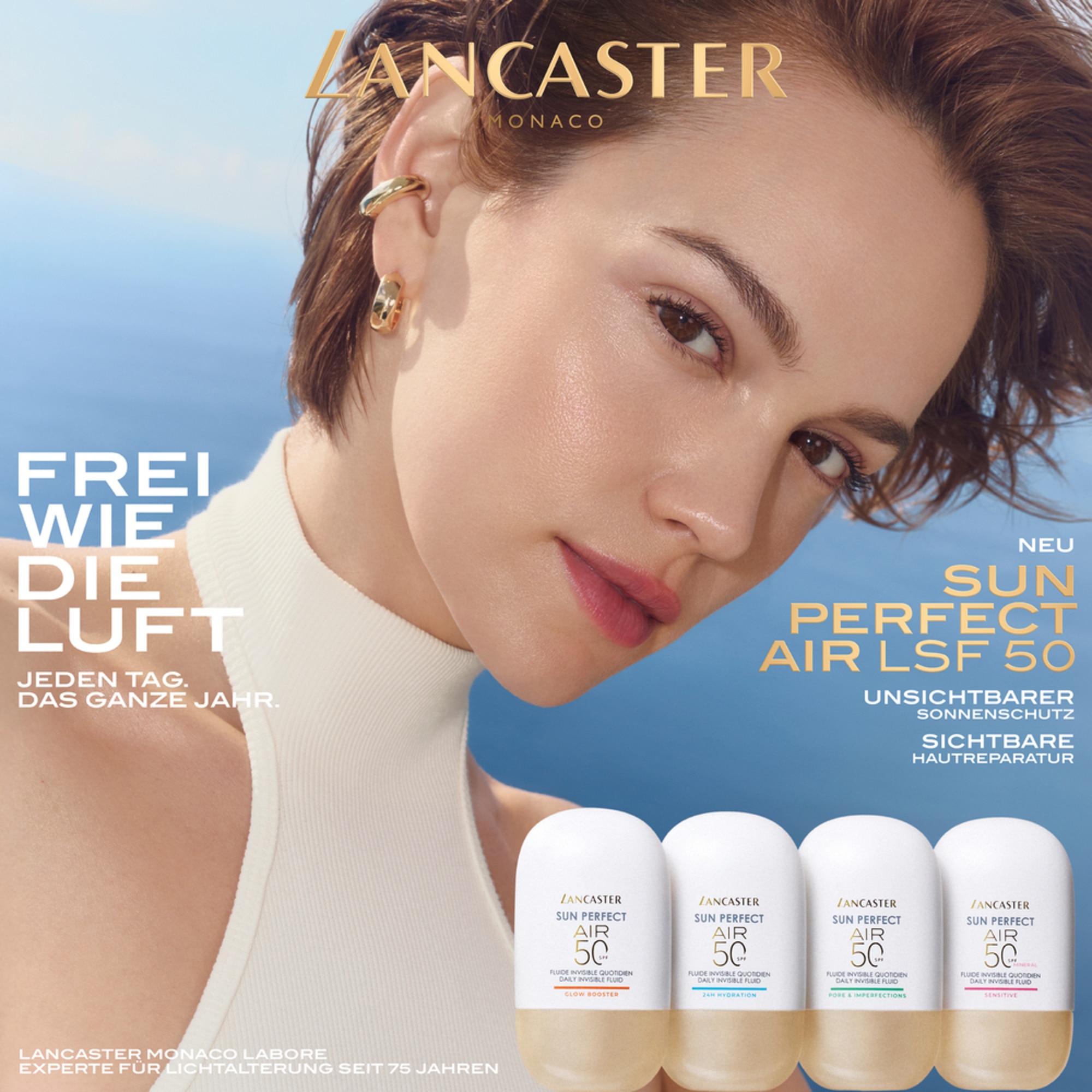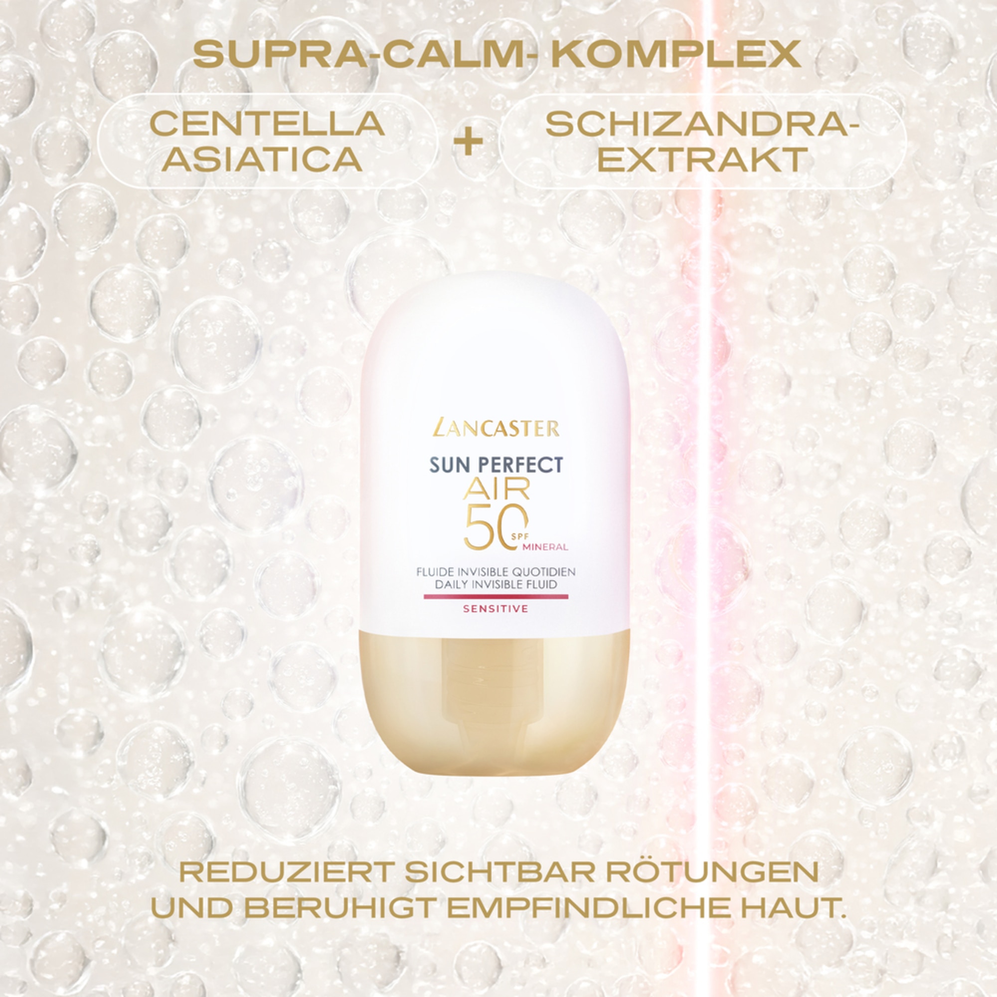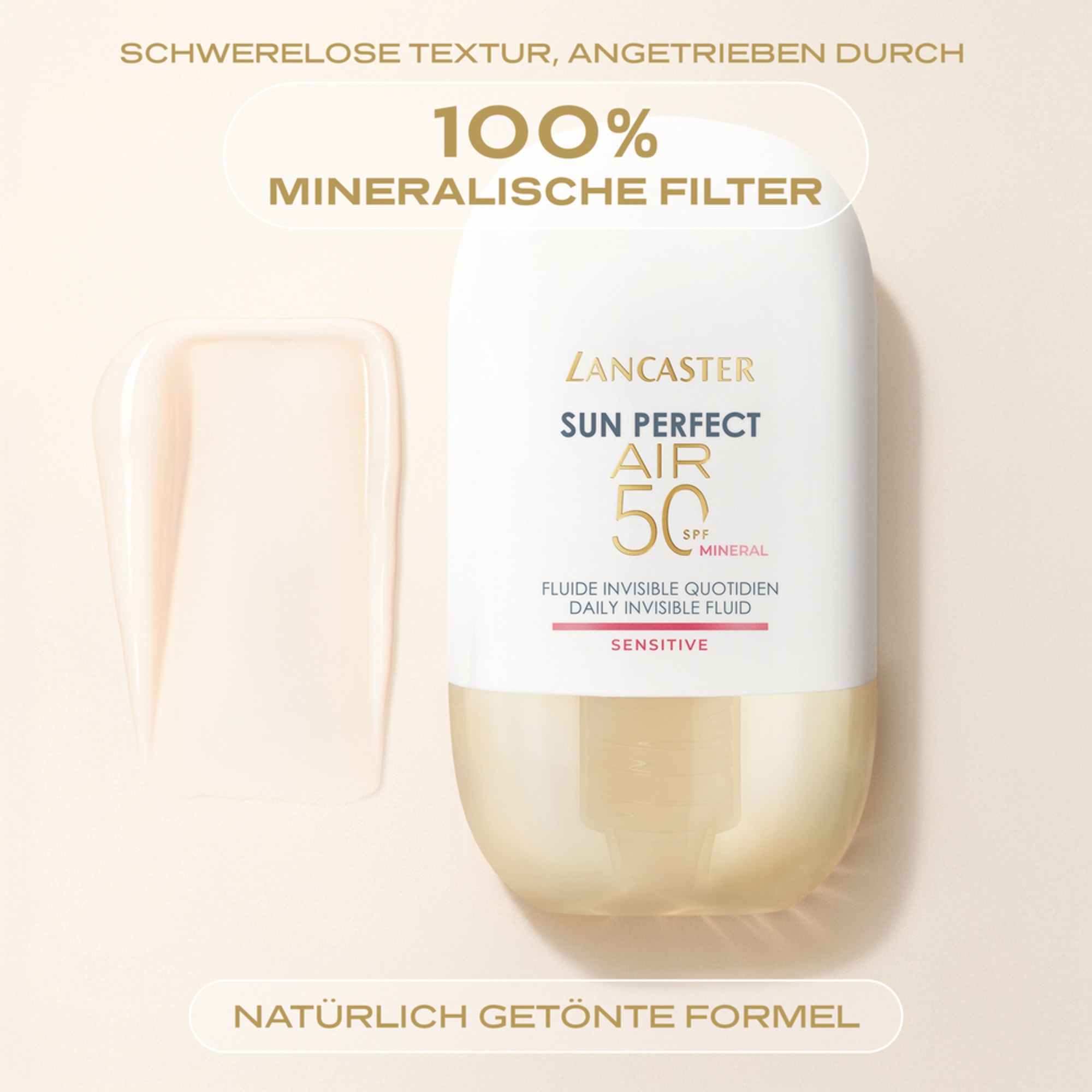 UNSICHTBARER SONNENSCHUTZ. SICHTBARE HAUTREPARATUR.Mit einer bahnbrechenden Formulierung, die unsichtbaren Sonnenschutz und zielgerichtete Korrektur bei Hautproblemen mithilfe dermatologischer Wirkstoffe kombiniert, definiert Lancaster Sun Perfect AIR Daily Invisible Fluid SPF 50 Sensitive Mineral UV-Schutz für jeden Tag neu. Dieses Lancaster Sonnenschutz-Fluid, das speziell für empfindliche, zu Rötungen neigende Haut entwickelt wurde und zur Anwendung nach kosmetischen Eingriffen geeignet ist, bietet vereint leistungsstarken Schutz für jeden Tag mit beruhigenden Eigenschaften.Die ultraleichte Textur mit 100 % mineralischen Filtern sorgt für ein atmungsaktives, schwereloses, unsichtbares Finish - ganz ohne Beschweren oder weiße Rückstände. Unterstützt durch eine exklusive Zweifach-Technologie:• Zum Patent angemeldete Full Light Technology: Dieses Lancaster Sun Perfect Fluid schirmt die Haut vor UVB-, UVA- und Infrarotstrahlen sowie sichtbaren Lichtstrahlen (einschließlich blauem Licht) ab und bietet somit einen umfassenden Breitbandschutz vor täglicher Sonneneinwirkung.• Patentierte* AIR-O₂-Technologie: Die exklusive, leistungsstarke zelluläre Sauerstoffversorgung von Lancaster, die den Hautzellen neue Energie und Vitalität schenkt.**Angereichert mit Supra-Calm-Komplex [Centella Asiatica + Schisandra-Extrakt], reduziert die Formulierung Rötungen sichtbar und beruhigt empfindliche Haut.Mit jedem Tag offenbart die Haut ihre natürliche Perfektion.Die leicht getönte Formulierung sorgt für ein äußerst natürliches Finish.Nicht fettende, schnell einziehende Textur.Ideal als Make-up-GrundlageParfümfrei.Nicht komedogen.An empfindlicher, zu Rötungen und Rosazea neigender Haut getestet.Zur Anwendung nach kosmetischen Eingriffen geeignet.***.Klinisch bewiesene Ergebnisse:-27 % reduzierte Rötungen nach einem Monat.****97 % verspürten eine augenblickliche Linderung unangenehmer Hautgefühle (Jucken, Brennen, Trockenheit).*****98 % empfanden ihre Haut schon nach 1 Woche als beruhigt, mit Feuchtigkeit versorgt und angenehm gepflegt.*****100 % stellten eine Verbesserung bei Rötungen und einen ebenmäßigeren, perfektionierten Teint nach 4 Wochen fest.*****100 % bestätigen, dass sich die Formulierung schwerelos anfühlt, in Sekundenschnelle mit der Haut verschmilzt und dank ihrer schnell einziehenden Textur keine Rückstände hinterlässt.******US10278914B2***Getestet nach nicht-ablativen Behandlungen.****Klinischer Test an 63 Frauen nach Anwendung von Sun Perfect AIR Daily Invisible Fluid SPF50 Sensitive zweimal täglich über 4 Wochen.*****Verbrauchertest an 63 Frauen nach Anwendung von Sun Perfect AIR Daily Invisible Fluid SPF50 Sensitive zweimal täglich über 4 Wochen.