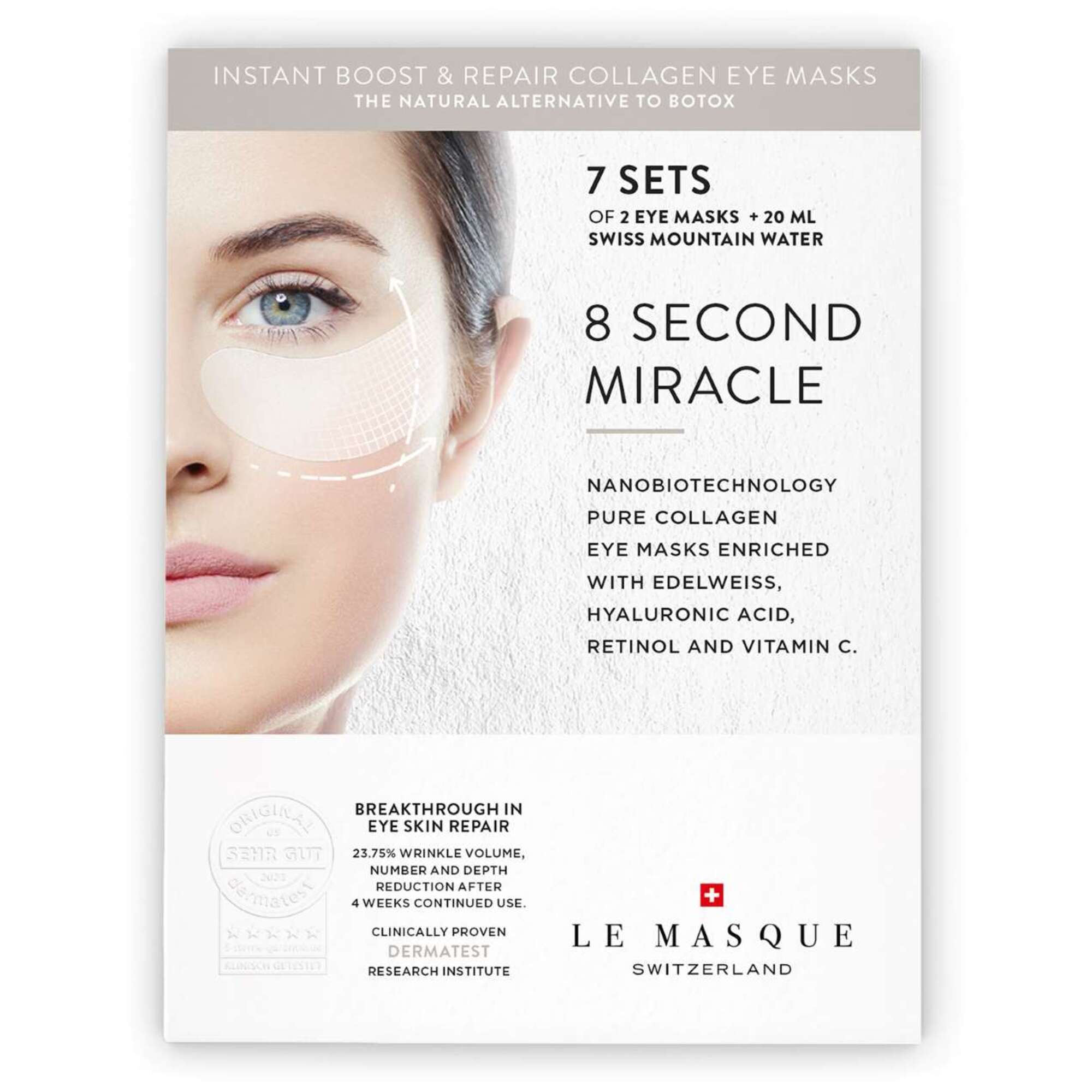Nanotechnologische Augenmasken aus reinem Kollagen, angereichert mit Edelweiss, Hyaluronsäure, Retinol und Vitamin C.