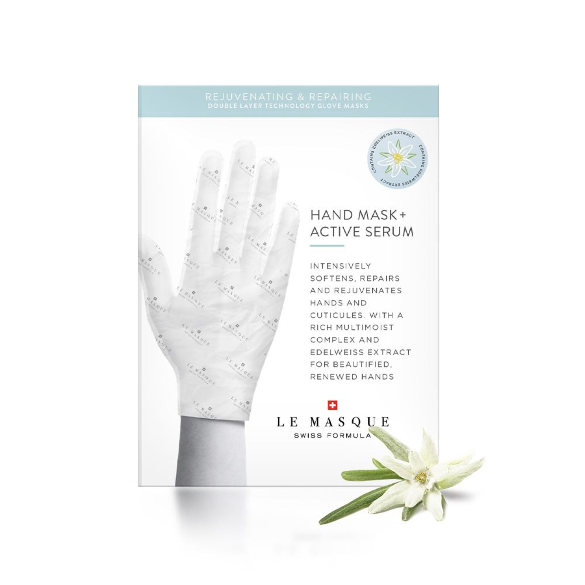 Die Le Masque-Handschuhe sind mit einem reichhaltigen Multimoist-Komplex und Edelweiß-Extrakt angereichert, um die sichtbaren Zeichen der Hautalterung zu reduzieren. Das Edelweiß ist eine kleine weisse Blume, die in Europa in den Alpen wächst und in der Schweiz am häufigsten vorkommt. Der Extrakt dieser Blume ist eines der besten Anti-Aging-Produkte und hellt Pigmentflecken auf natürliche Weise auf. Es hilft, die Widerstandsfähigkeit der Haut aufzubauen, schützt die Hautzellen und gibt ihnen die Möglichkeit, sich zu regenerieren und wieder aufzubauen. Erwarten Sie weichere, schönere Hände, die nach nur 20 Minuten optimal aussehen.