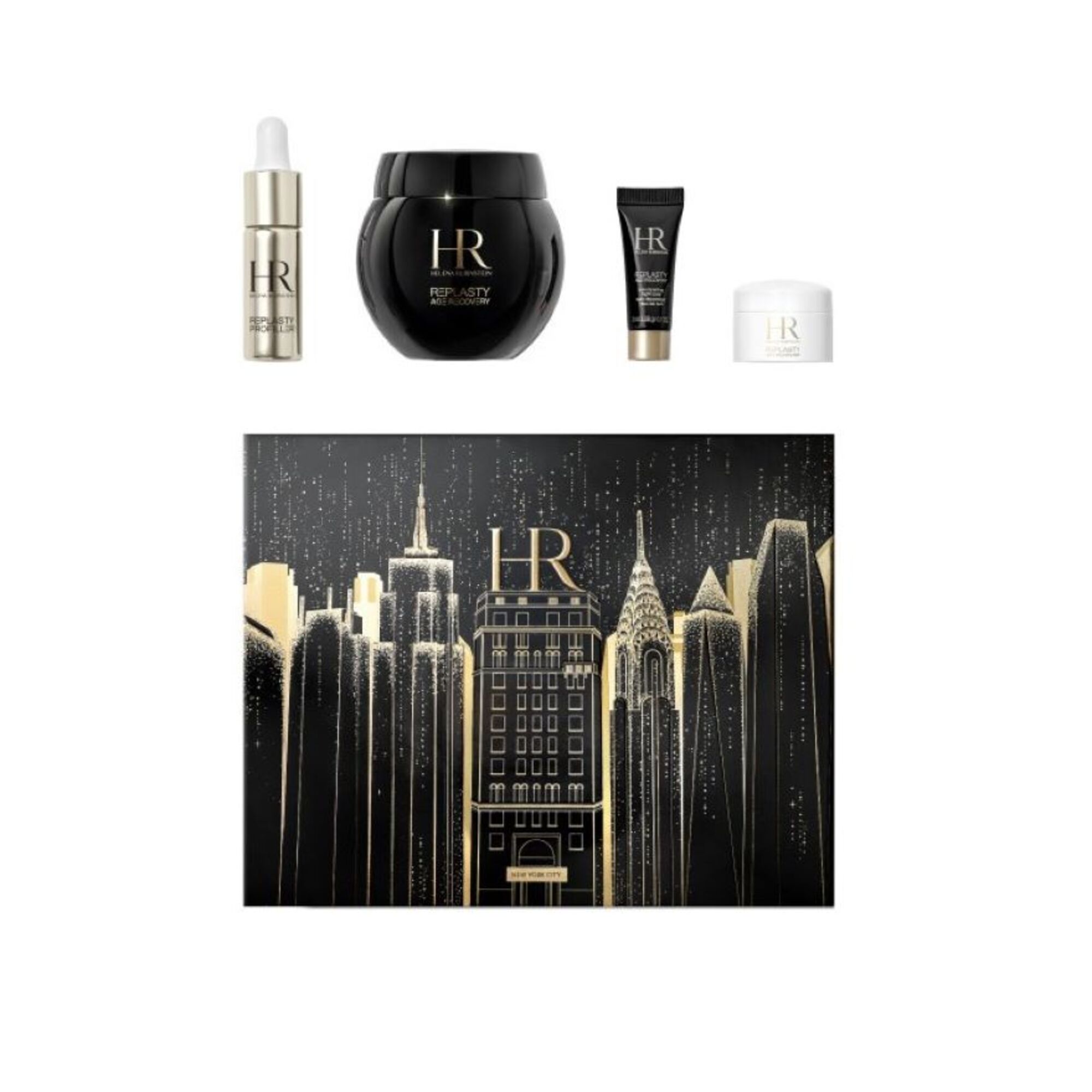 Le coffret Replasty contient une crème de nuit, un sérum Profiller, une crème de jour et une crème contour des yeux. Le soin Re Plasty Age Recovery Night d'Helena Rubinstein atténue les traces visibles du vieillissement cutané et crée comme par magie un grain de peau perfectionné pendant votre sommeil. Le sérum Replasty Profiller est l'alternative parfaite aux interventions cosmétiques à base d’acide hyaluronique. Avec cinq acides hyaluroniques différents, le sérum cible cinq types de rides. Le Profiller a ainsi un effet particulièrement lissant, régénérant et raffermissant. La Replasty Age Recovery Day Cream est un soin de jour apaisant pour la peau de Helena Rubinstein. Elle a été spécialement conçue pour répondre aux besoins des peaux sensibles et matures et a un effet à la fois apaisant, protecteur et hydratant. Pour cela, la formule anti-inflammatoire contient du tasmanol, également connu sous le nom d'extrait de feuilles de poivre de montagne, ainsi que des madécassossides et de la niacinamide. Cette combinaison permet d’atténuer les signes de la peau sensible, tels que les rougeurs, la sécheresse et les inflammations- pour une sensation de peau confortable et hydratée ! Découvrez maintenant dans la série Replasty Age Recovery le soin correcteur contour des yeux pour la nuit. Un soin spécialement conçu pour le contour des yeux (sans alcool, sans parabènes, sans parfums) qui se caractérise par une texture bandage enrichie de 30% de solution Pro-Xylane* et de quatre acides hyaluroniques différents. *Se réfère au contenu de la matière première (WATER, HYDROXYPROPYL TETRAHYDROPYRANTRIOL. PROPYLENE GLYCOL) ajouté à la formule.