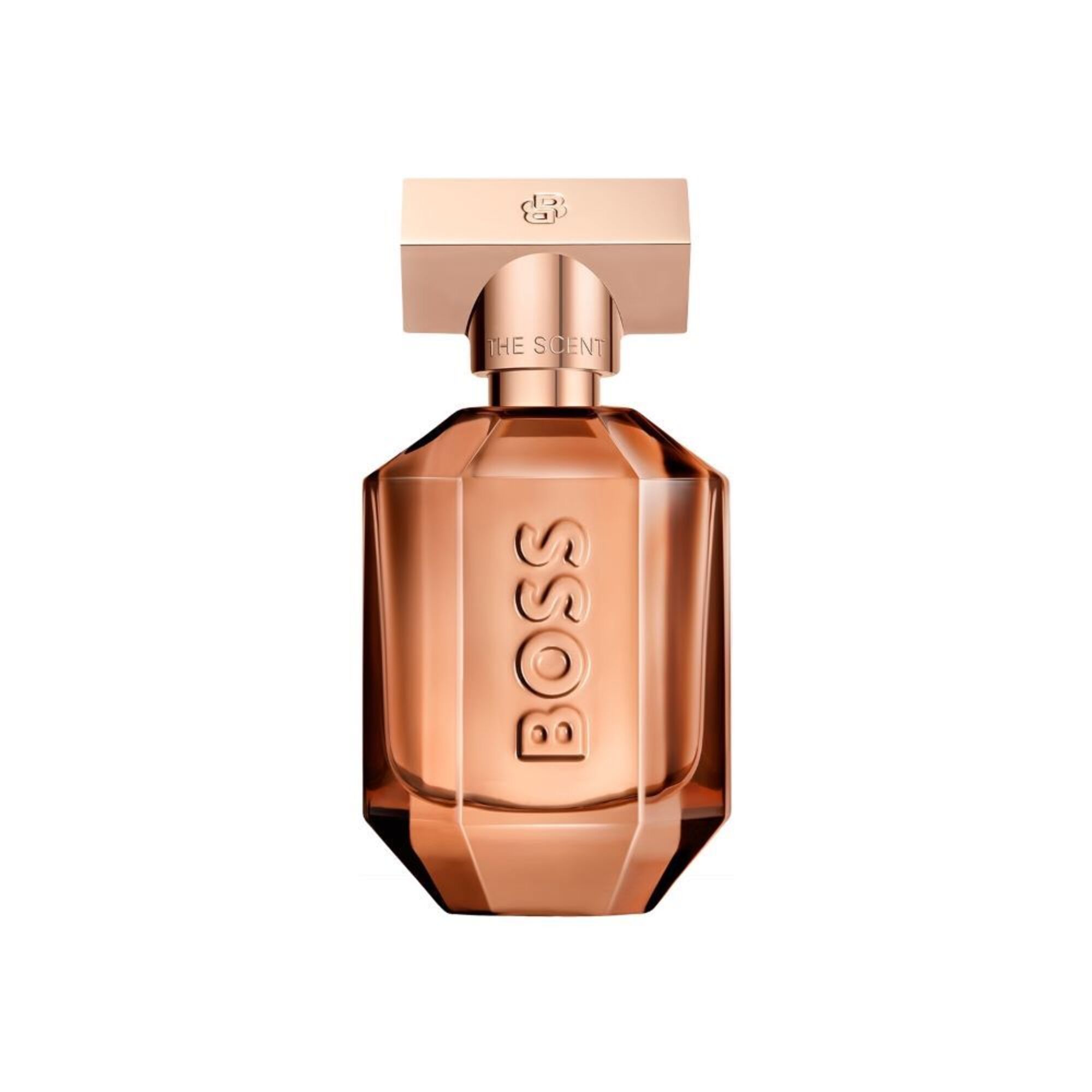 BOSS The Scent Parfum for Her réinterprète la puissance de la sensualité dans un flacon accrocheur, orné du logo BOSS surdimensionné sur un verre laqué taupe clair et d'un capuchon en or rose avec un double monogramme B. La forme à facettes qui attire l'attention reflète l'épreuve de force sensuelle de cette fragrance enivrante et évoque les multiples facettes d'un couple de choc.