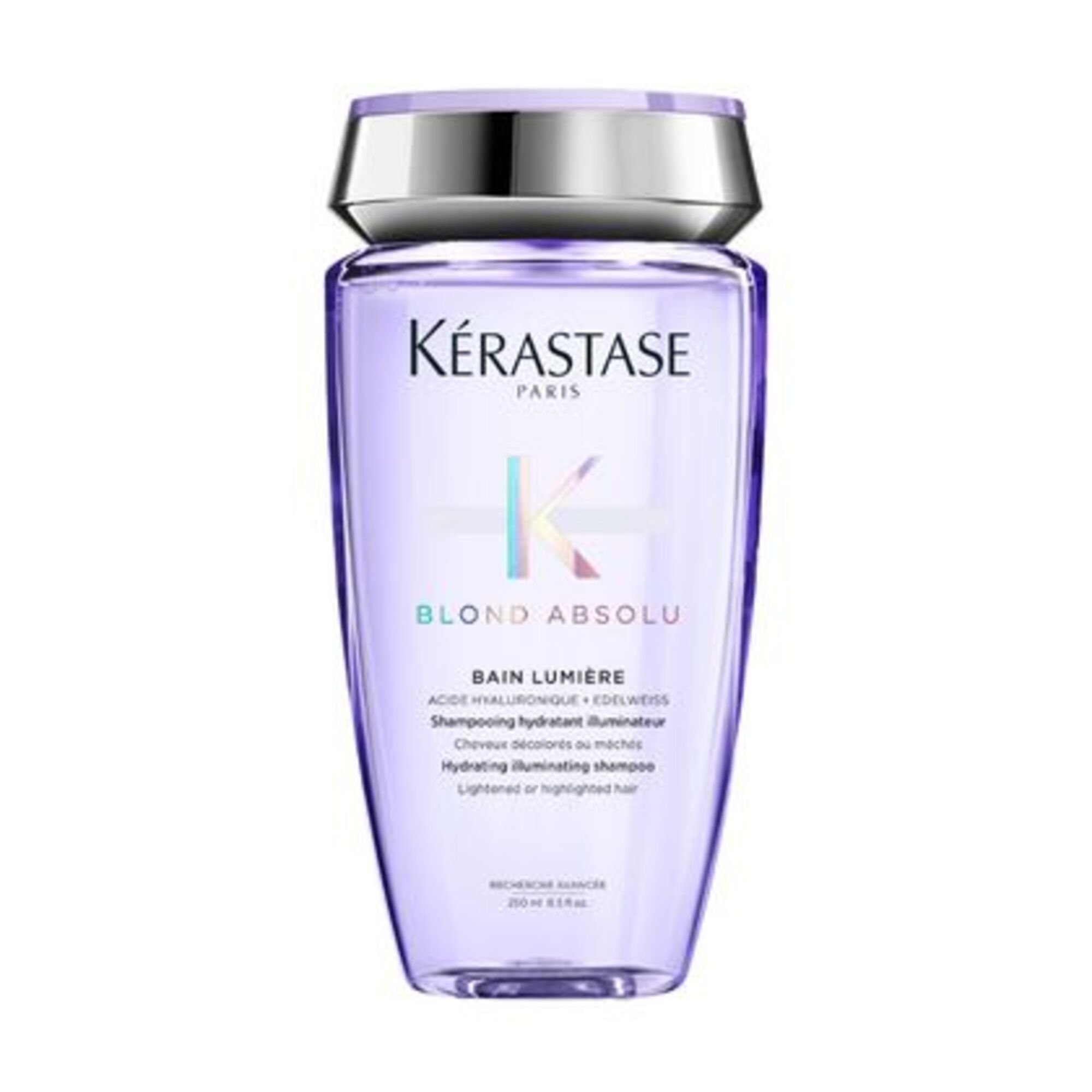 Il détoxifie également le cheveu de la pollution et enlève les agents matifiants. Enrichi d'une association puissante d'acide hyaluronique et de fleur d'Edelweiss, le Bain Lumière Blond Absolu de Kérastase nourrit profondément la fibre pour illuminer le blond. L'acide hyaluronique remplit et cicatrise les dommages de la fibre de l'intérieur pour une cuticule uniforme et profondément nourrie. Cet acide ultra concentré renforce les cheveux et prévient la casse future. La fleur d'edelweiss est riche en antioxydants pour protéger les cheveux contre les dommages quotidiens. Elle adoucit et apaise également la fibre capillaire sensibilisée.