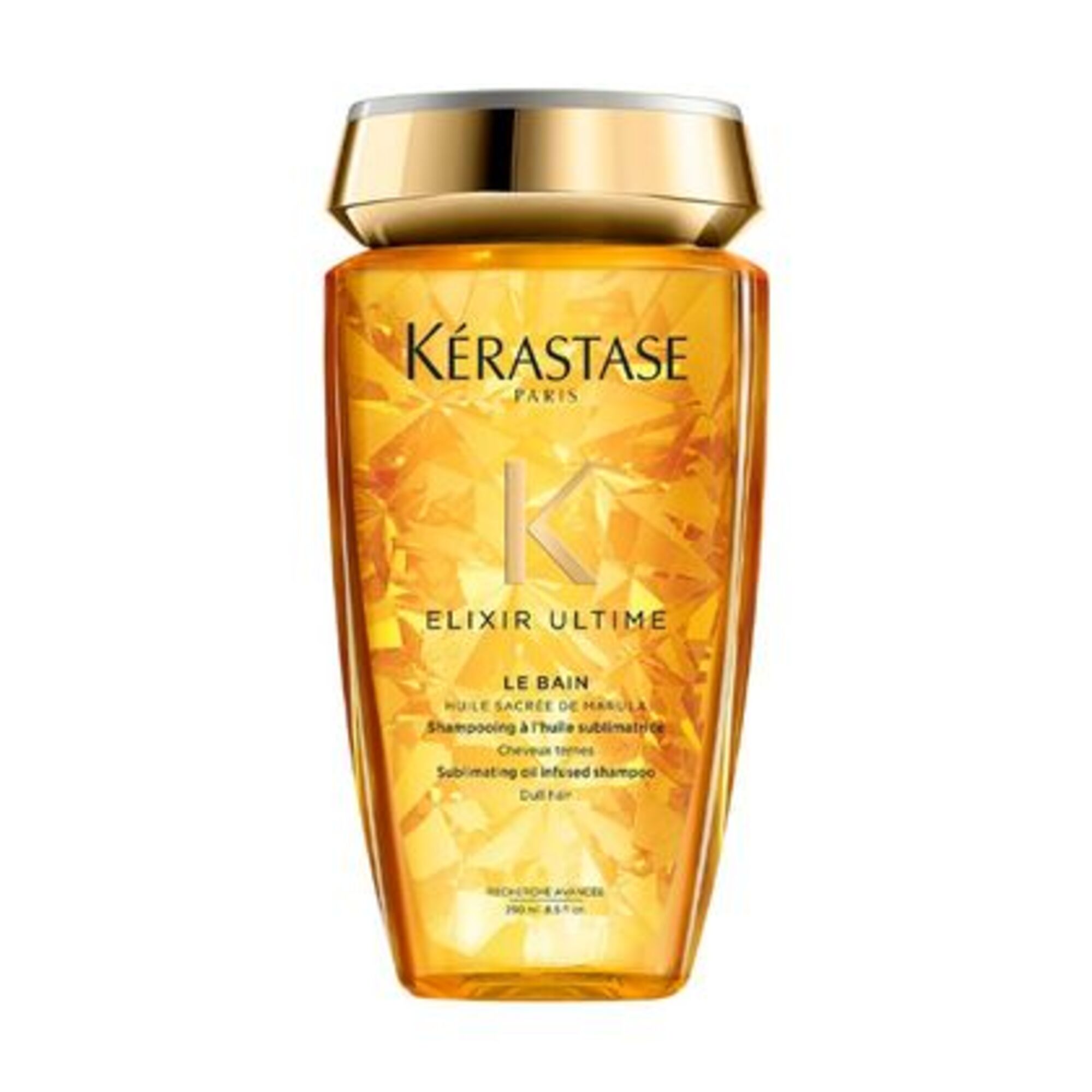 Bain Elixir Ultime de Kérastase est un shampoing enrichi à l'huile de marula et camélia pour cheveux ternes, nourrit sans alourdir. Usage quotidien. Effet Anti-Frizz