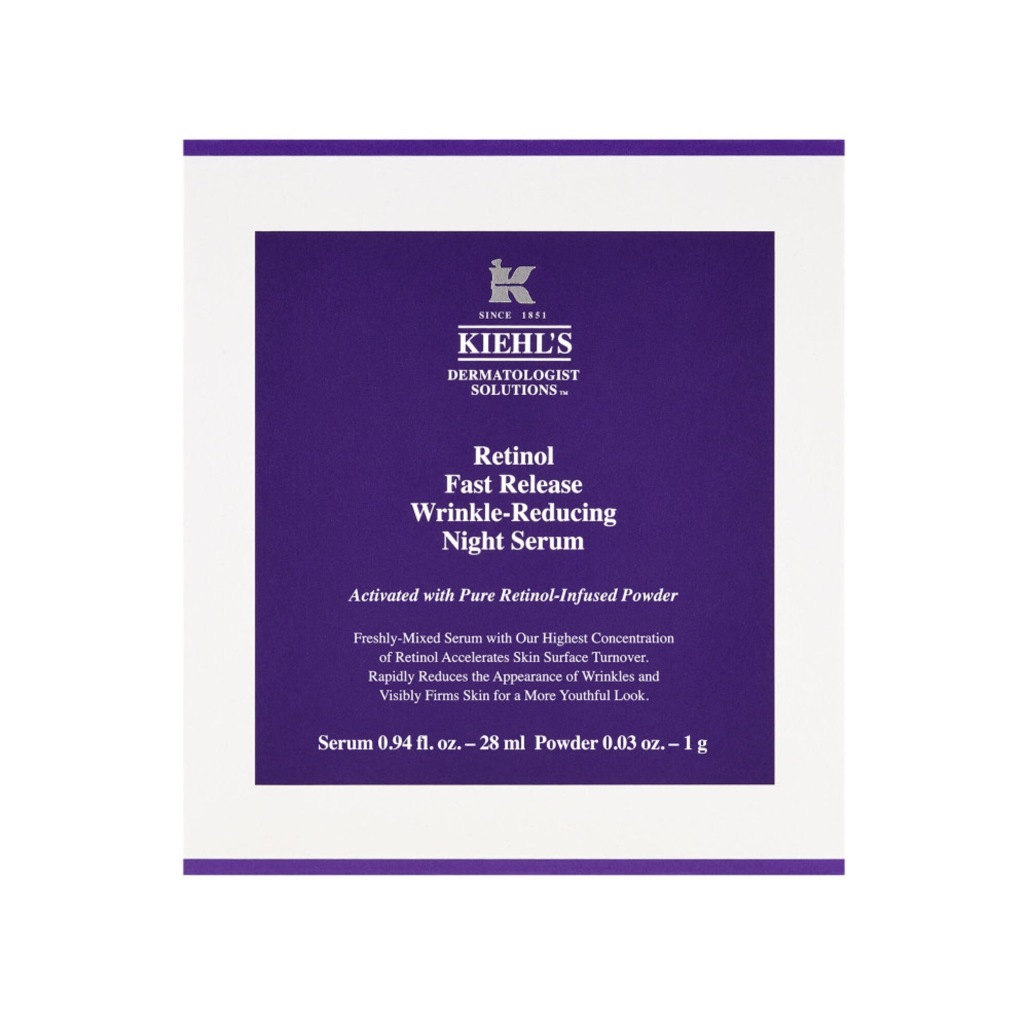 Le Fast Release Wrinkle-Reducing Night Serum de Kiehl's est un sérum de nuit au rétinol 0,3 % à action rapide. Il accélère le renouvellement des cellules de la surface de la peau grâce au rétinol qui pénètre jusqu'à 15 couches superficielles en profondeur dans la peau. Faites l'expérience d'une réduction visible des ridules en seulement 5 jours, et d'une amélioration visible des rides profondes en 2 semaines. Pour garantir une efficacité maximale, son emballage innovant isole une forte concentration de poudre de rétinol pure afin qu'elle puisse être fraîchement mélangée au sérum dès la première utilisation. En utilisation continue, ce sérum de nuit au rétinol aide la peau à se renouveler pour une apparence visiblement plus lisse et plus jeune.