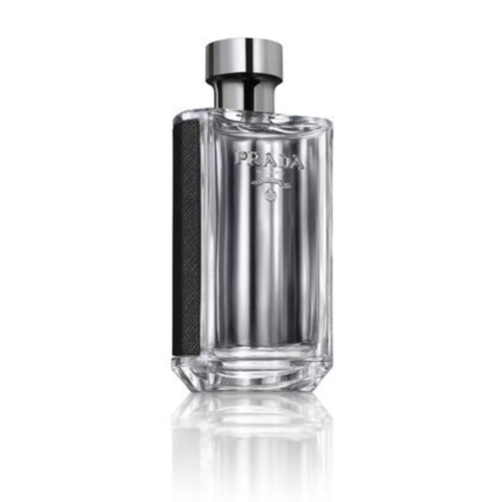 L'HOMME PRADA utilise le langage classique et symbolique de la maison de couture. Le cuir iconique Prada Saffiano enveloppe le dos arrondi du flacon en noir et fait écho au design hachuré élégant, gaufré et sophistiqué. Le logo original de PRADA apparaît en relief argenté sur le devant du flacon et se reflète à l'arrière. Les couleurs absolues de la maison, le noir et l'argent, sont utilisées pour le parfum masculin, reflétant les notes plus fraîches du parfum, le verre gris soulignant ce classicisme. La conception presque architecturale du flacon rappelle les intérieurs des boîtes à bijoux de PRADA ; un miroir à l'intérieur du flacon réfracte la lumière et multiplie l'imagerie. Il reflète la diversité des identités de L'HOMME PRADA et la nature multiforme de la maison PRADA elle-même.